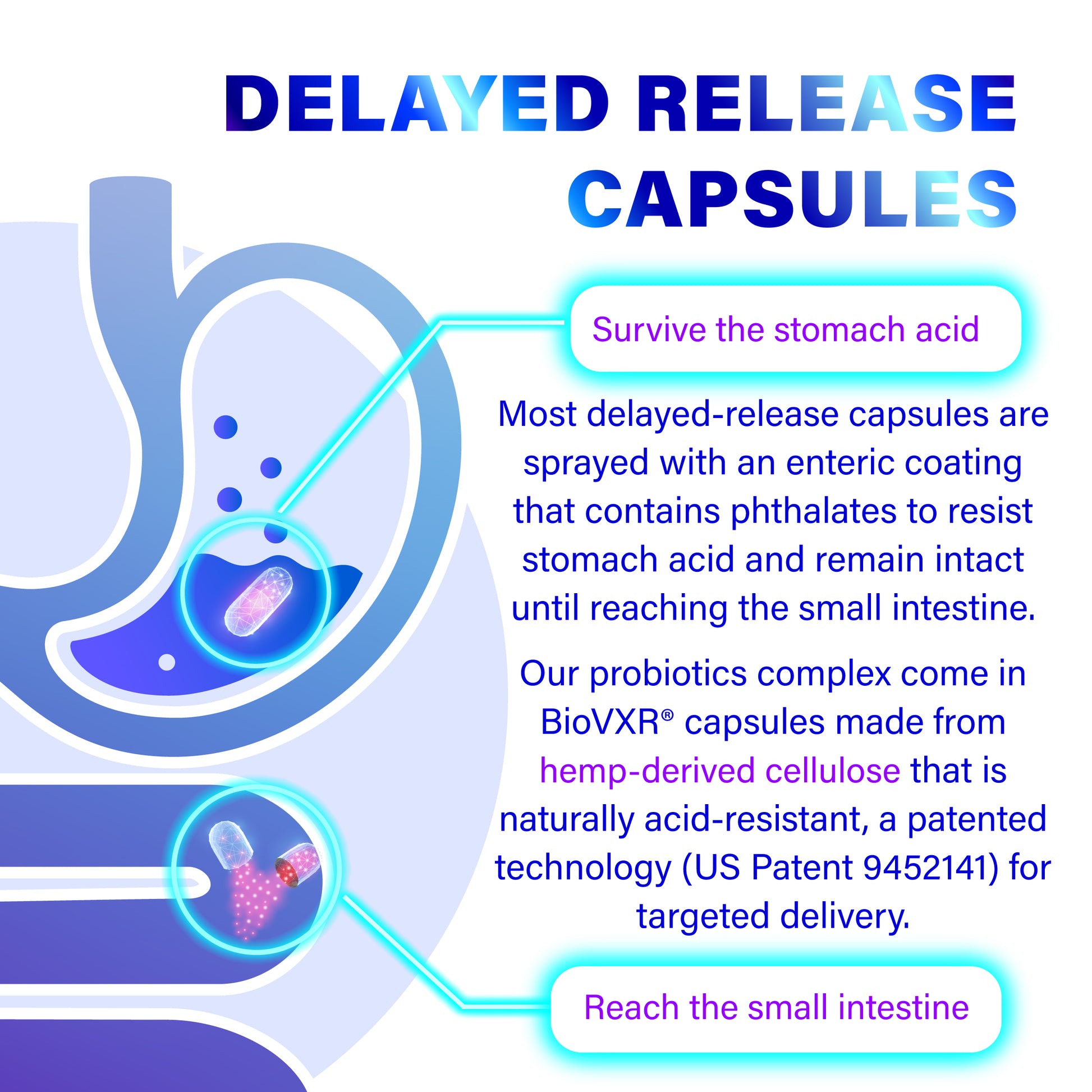 Our probiotic complex uses BioVXR® capsules made from naturally acid-resistant hemp fiber, a patented technology (US Patent 9452141) for phthalate-free, targeted small intestine delivery.Innovative BioVXR® Capsules